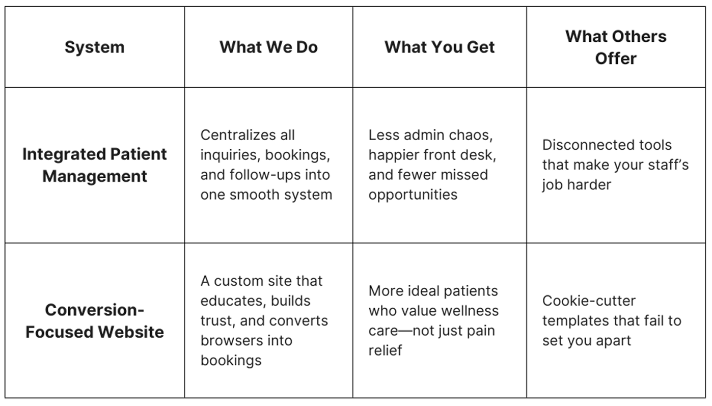 I realized the issue wasn’t a lack of marketing tactics—it was a lack of dependable, well-designed systems. Most marketing out there just isn’t built for healthcare, and especially not for chiropractic. It overlooks the real challenges: building trust with people who are hurting, navigating strict compliance, and being seen as a true healthcare provider—not a commodity.