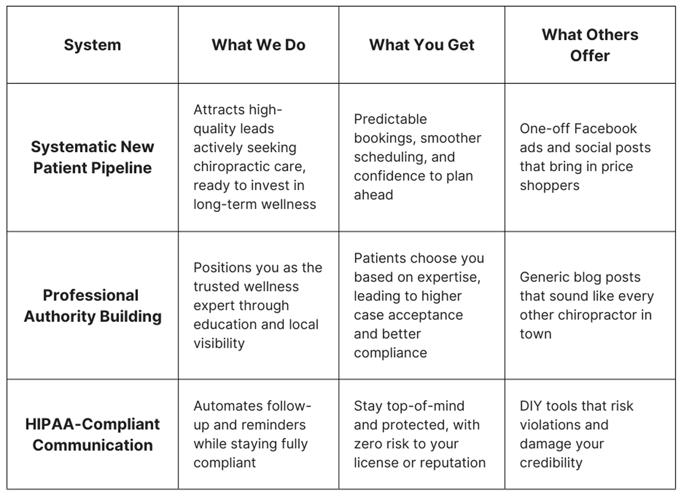 Because chiropractors don’t need hype. They need strategy.They don’t need a flashy ad. They need a system that just works.
