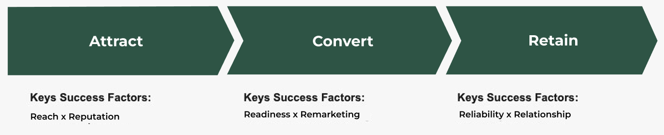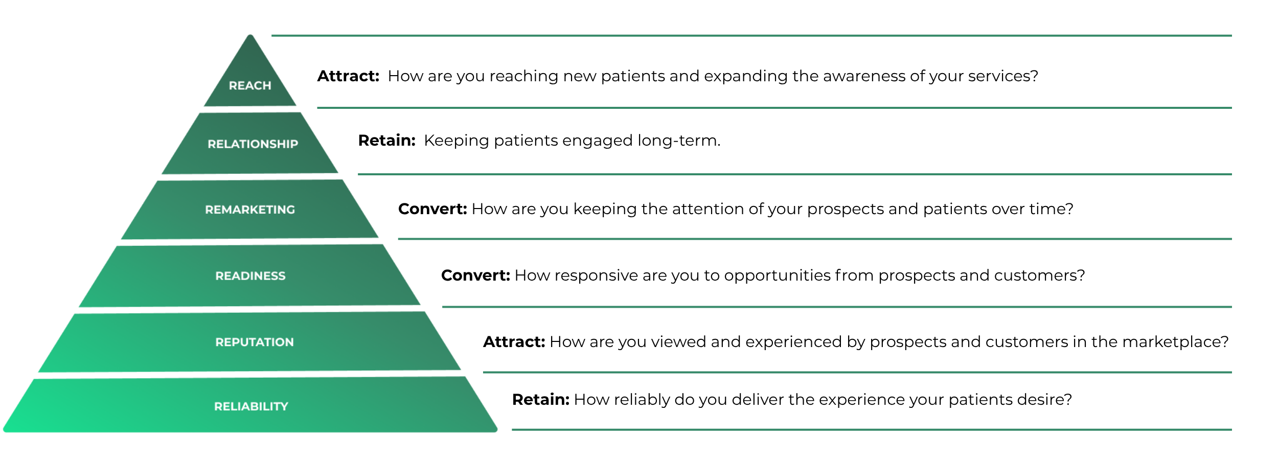 We don’t sell random tactics. We install one simple, repeatable system that moves people from discovering you (Attract), to becoming a patient of yours (Convert), to staying and referring (Retain).