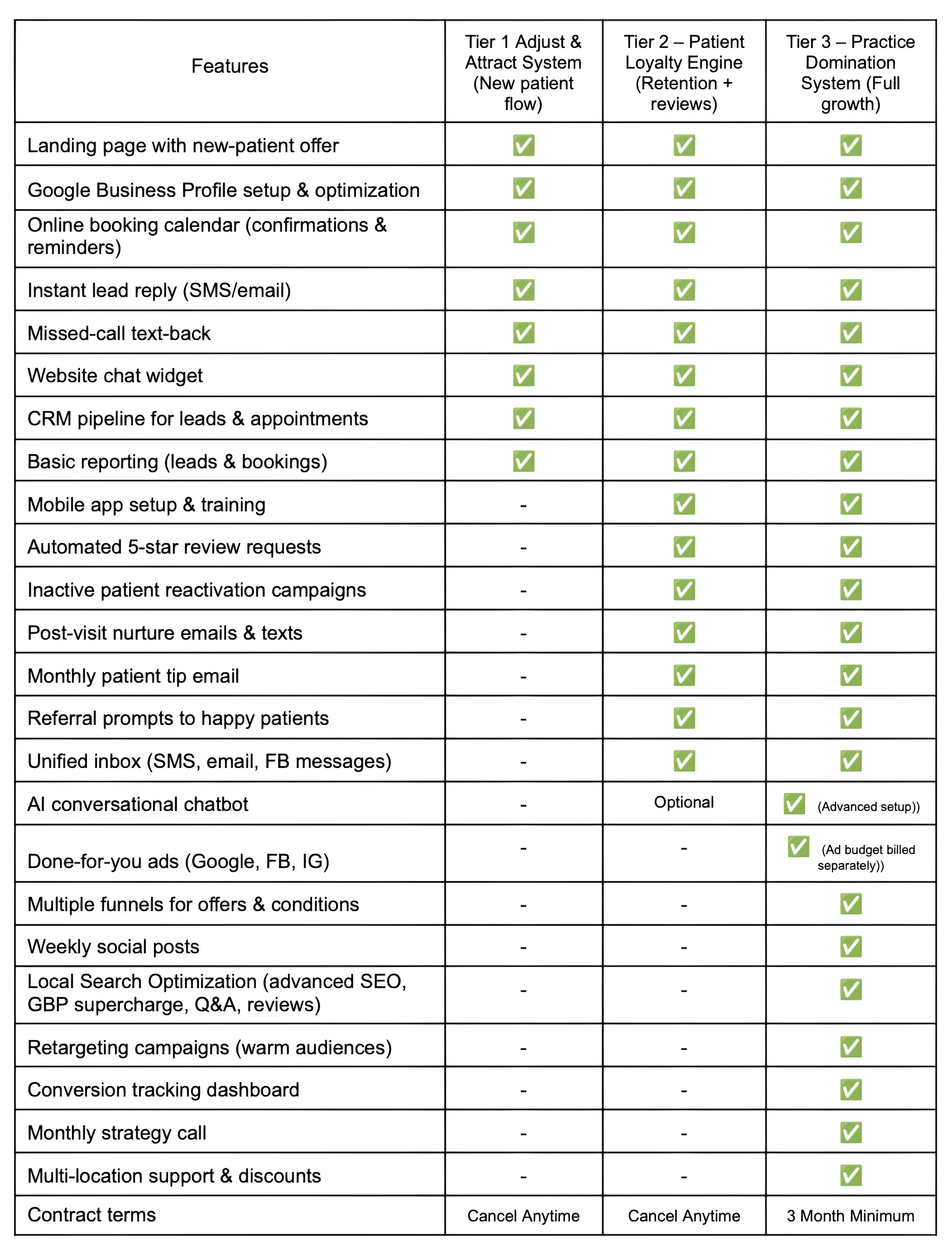 Marketing Tiers → Adjust & Attract, Patient Loyalty Engine, Practice Domination