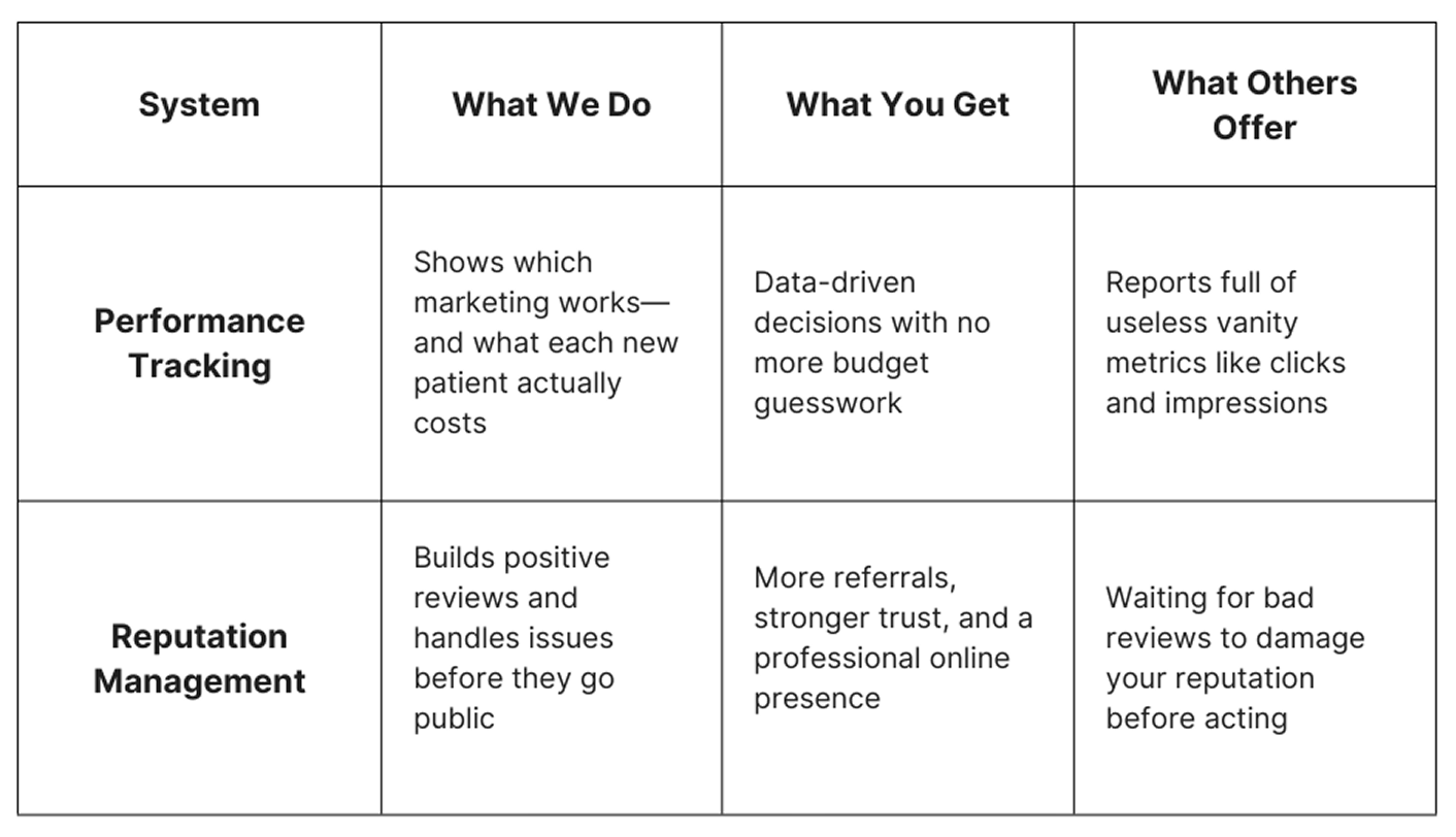 We build marketing systems that bring in new patients month after month—so you can finally plan ahead with confidence and invest in your growth without second-guessing.